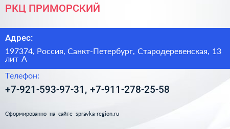 РКЦ-ПРИМОРСКИЙ по адресу 197374, Россия, Санкт-Петербург, Стародеревенская, 13 лит А в дальнейшем Организация, размещена в следующих категориях: