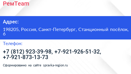 РемTeam по адресу 198205, Россия, Санкт-Петербург, Станционный посёлок, 6 в дальнейшем Организация, размещена в следующих категориях: