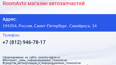 RoomAvto, магазин автозапчастей по адресу 194354, Россия, Санкт-Петербург, Сикейроса, 14 в дальнейшем Организация, размещена в следующих категориях: