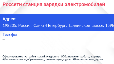 Россети, станция зарядки электромобилей по адресу 198205, Россия, Санкт-Петербург, Таллинское шоссе, 159Б в дальнейшем Организация, размещена в следующих категориях: