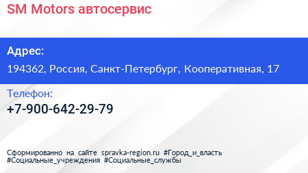 SM-Motors, автосервис по адресу 194362, Россия, Санкт-Петербург, Кооперативная, 17 в дальнейшем Организация, размещена в следующих категориях: