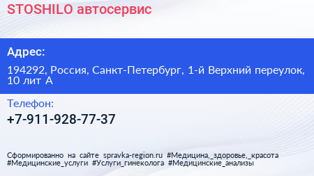 STOSHILO, автосервис по адресу 194292, Россия, Санкт-Петербург, 1-й Верхний переулок, 10 лит А в дальнейшем Организация, размещена в следующих категориях: