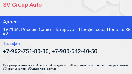 SV Group Auto по адресу 197136, Россия, Санкт-Петербург, Профессора Попова, 38 к2 в дальнейшем Организация, размещена в следующих категориях:
