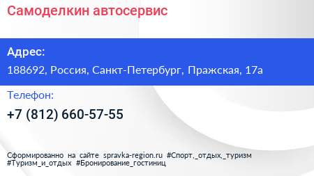 Самоделкин, автосервис по адресу 188692, Россия, Санкт-Петербург, Пражская, 17а в дальнейшем Организация, размещена в следующих категориях: