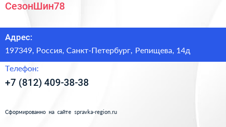 СезонШин78 по адресу 197349, Россия, Санкт-Петербург, Репищева, 14д в дальнейшем Организация, размещена в следующих категориях: