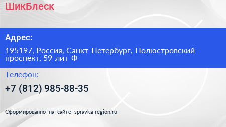 ШикБлеск по адресу 195197, Россия, Санкт-Петербург, Полюстровский проспект, 59 лит Ф в дальнейшем Организация, размещена в следующих категориях: