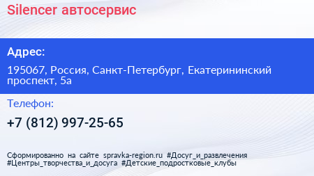 Silencer, автосервис по адресу 195067, Россия, Санкт-Петербург, Екатерининский проспект, 5а в дальнейшем Организация, размещена в следующих категориях: