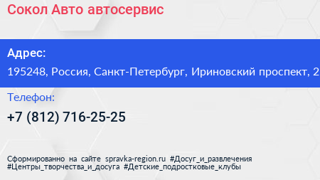 Сокол-Авто, автосервис по адресу 195248, Россия, Санкт-Петербург, Ириновский проспект, 2 в дальнейшем Организация, размещена в следующих категориях: