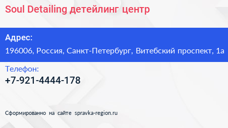 Soul Detailing, детейлинг-центр по адресу 196006, Россия, Санкт-Петербург, Витебский проспект, 1а в дальнейшем Организация, размещена в следующих категориях: