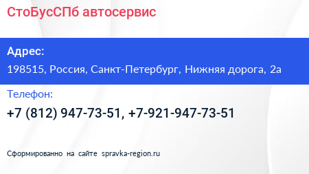 СтоБусСПб, автосервис по адресу 198515, Россия, Санкт-Петербург, Нижняя дорога, 2а в дальнейшем Организация, размещена в следующих категориях: