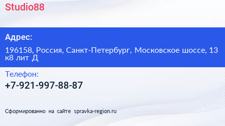 Studio88 по адресу 196158, Россия, Санкт-Петербург, Московское шоссе, 13 к8 лит Д в дальнейшем Организация, размещена в следующих категориях: