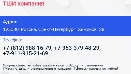 ТШИ, компания по адресу 195030, Россия, Санкт-Петербург, Химиков, 28 в дальнейшем Организация, размещена в следующих категориях: