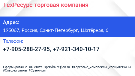 ТехРесурс, торговая компания по адресу 195067, Россия, Санкт-Петербург, Шатёрная, 6 в дальнейшем Организация, размещена в следующих категориях: