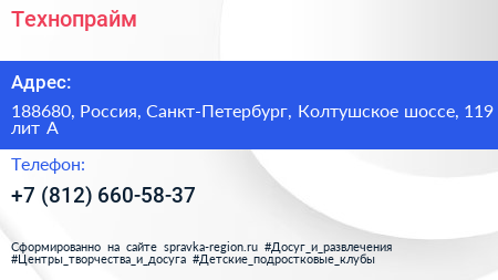 Технопрайм по адресу 188680, Россия, Санкт-Петербург, Колтушское шоссе, 119 лит А в дальнейшем Организация, размещена в следующих категориях: