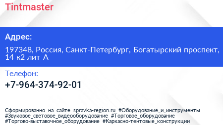 Tintmaster по адресу 197348, Россия, Санкт-Петербург, Богатырский проспект, 14 к2 лит А в дальнейшем Организация, размещена в следующих категориях: