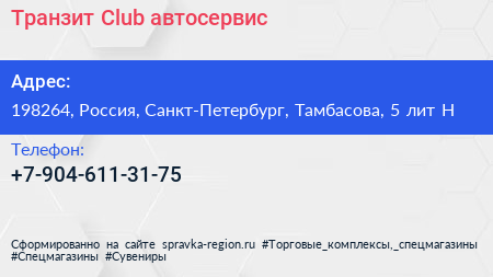 Транзит Club, автосервис по адресу 198264, Россия, Санкт-Петербург, Тамбасова, 5 лит Н в дальнейшем Организация, размещена в следующих категориях: