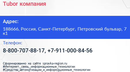 Tubor, компания по адресу 188666, Россия, Санкт-Петербург, Петровский бульвар, 7 к1 в дальнейшем Организация, размещена в следующих категориях: