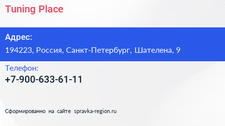 Tuning Place по адресу 194223, Россия, Санкт-Петербург, Шателена, 9 в дальнейшем Организация, размещена в следующих категориях: