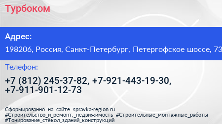 Турбоком по адресу 198206, Россия, Санкт-Петербург, Петергофское шоссе, 73 в дальнейшем Организация, размещена в следующих категориях: