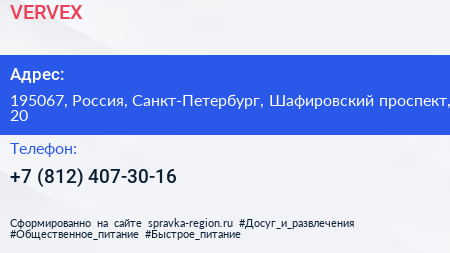 VERVEХ по адресу 195067, Россия, Санкт-Петербург, Шафировский проспект, 20 в дальнейшем Организация, размещена в следующих категориях: