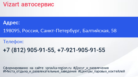Vizart, автосервис по адресу 198095, Россия, Санкт-Петербург, Балтийская, 58 в дальнейшем Организация, размещена в следующих категориях: