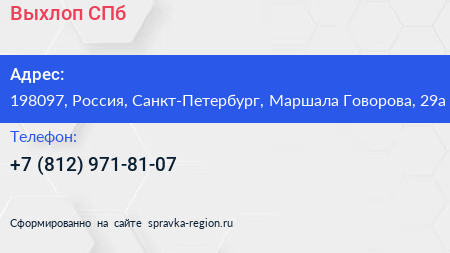 Выхлоп-СПб по адресу 198097, Россия, Санкт-Петербург, Маршала Говорова, 29а в дальнейшем Организация, размещена в следующих категориях: