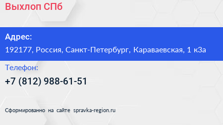 Выхлоп-СПб по адресу 192177, Россия, Санкт-Петербург, Караваевская, 1 к3а в дальнейшем Организация, размещена в следующих категориях: