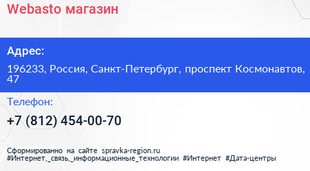 Webasto, магазин по адресу 196233, Россия, Санкт-Петербург, проспект Космонавтов, 47 в дальнейшем Организация, размещена в следующих категориях: