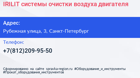IRILIT - системы очистки воздуха двигателя по адресу Рубежная улица, 3, Санкт-Петербург в дальнейшем Организация, размещена в следующих категориях:
