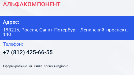 АЛЬФАКОМПОНЕНТ по адресу 198216, Россия, Санкт-Петербург, Ленинский проспект, 140 в дальнейшем Организация, размещена в следующих категориях: