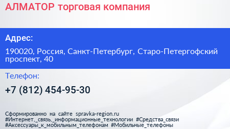 АЛМАТОР, торговая компания по адресу 190020, Россия, Санкт-Петербург, Старо-Петергофский проспект, 40 в дальнейшем Организация, размещена в следующих категориях: