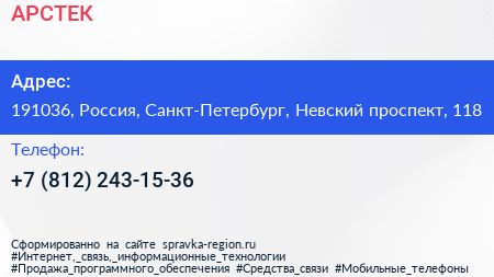 АРСТЕК по адресу 191036, Россия, Санкт-Петербург, Невский проспект, 118 в дальнейшем Организация, размещена в следующих категориях: