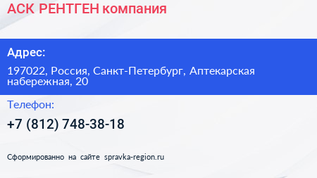 АСК-РЕНТГЕН, компания по адресу 197022, Россия, Санкт-Петербург, Аптекарская набережная, 20 в дальнейшем Организация, размещена в следующих категориях: