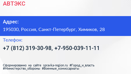 АВТЭКС по адресу 195030, Россия, Санкт-Петербург, Химиков, 28 в дальнейшем Организация, размещена в следующих категориях: