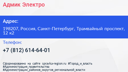 Адмик Электро по адресу 198207, Россия, Санкт-Петербург, Трамвайный проспект, 12 к2 в дальнейшем Организация, размещена в следующих категориях: