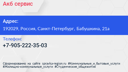 Акб-сервис по адресу 192029, Россия, Санкт-Петербург, Бабушкина, 21а в дальнейшем Организация, размещена в следующих категориях: