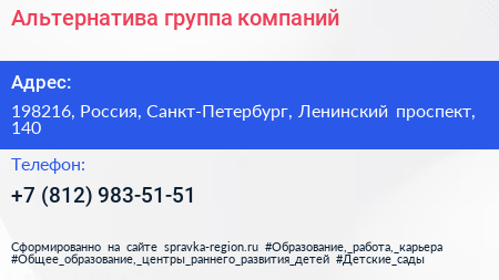 Альтернатива, группа компаний по адресу 198216, Россия, Санкт-Петербург, Ленинский проспект, 140 в дальнейшем Организация, размещена в следующих категориях: