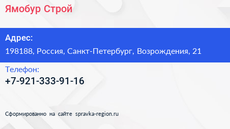 Ямобур Строй по адресу 198188, Россия, Санкт-Петербург, Возрождения, 21 в дальнейшем Организация, размещена в следующих категориях: