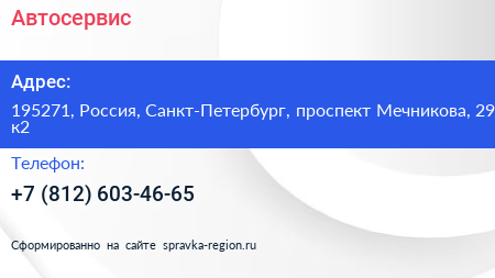 Автосервис по адресу 195271, Россия, Санкт-Петербург, проспект Мечникова, 29 к2 в дальнейшем Организация, размещена в следующих категориях: