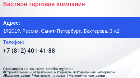 Бастион, торговая компания по адресу 192019, Россия, Санкт-Петербург, Бехтерева, 3 к2 в дальнейшем Организация, размещена в следующих категориях: