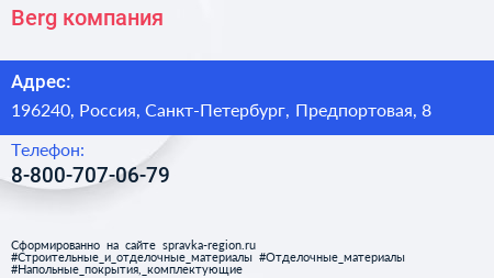 Berg, компания по адресу 196240, Россия, Санкт-Петербург, Предпортовая, 8 в дальнейшем Организация, размещена в следующих категориях:
