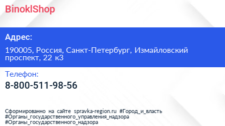 BinoklShop по адресу 190005, Россия, Санкт-Петербург, Измайловский проспект, 22 к3 в дальнейшем Организация, размещена в следующих категориях: