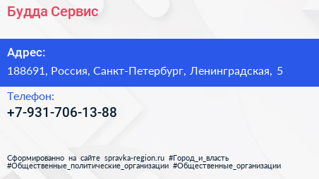 Будда Сервис по адресу 188691, Россия, Санкт-Петербург, Ленинградская, 5 в дальнейшем Организация, размещена в следующих категориях: