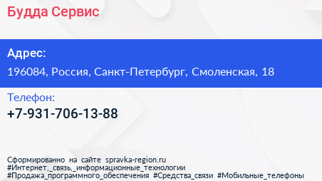 Будда Сервис по адресу 196084, Россия, Санкт-Петербург, Смоленская, 18 в дальнейшем Организация, размещена в следующих категориях: