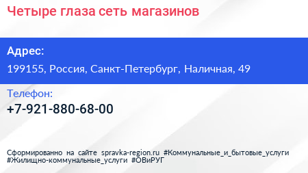 Четыре глаза, сеть магазинов по адресу 199155, Россия, Санкт-Петербург, Наличная, 49 в дальнейшем Организация, размещена в следующих категориях: