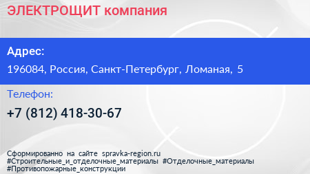 ЭЛЕКТРОЩИТ, компания по адресу 196084, Россия, Санкт-Петербург, Ломаная, 5 в дальнейшем Организация, размещена в следующих категориях: