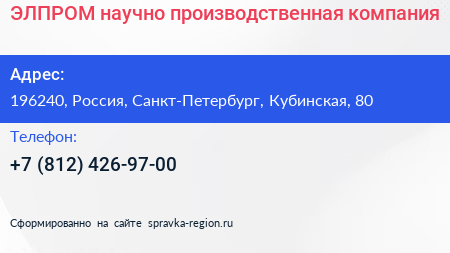 ЭЛПРОМ, научно-производственная компания по адресу 196240, Россия, Санкт-Петербург, Кубинская, 80 в дальнейшем Организация, размещена в следующих категориях: