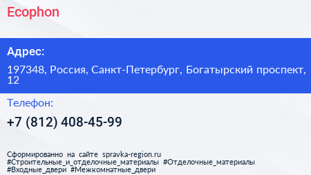 Ecophon по адресу 197348, Россия, Санкт-Петербург, Богатырский проспект, 12 в дальнейшем Организация, размещена в следующих категориях: