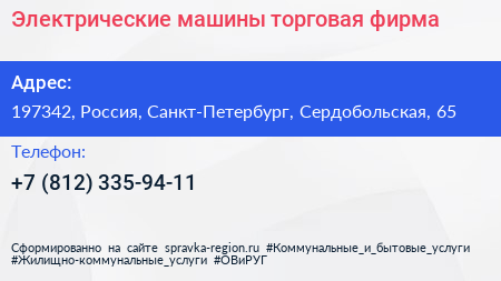 Электрические машины, торговая фирма по адресу 197342, Россия, Санкт-Петербург, Сердобольская, 65 в дальнейшем Организация, размещена в следующих категориях: