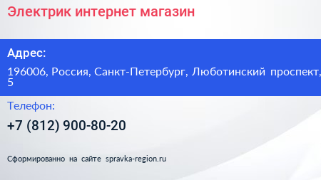 Электрик, интернет-магазин по адресу 196006, Россия, Санкт-Петербург, Люботинский проспект, 5 в дальнейшем Организация, размещена в следующих категориях: